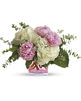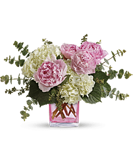 Good and girly! A fabulous pick for a stylish sister, friend or girlfriend, this trendy peony bouquet pairs lush, cloud-white hydrangea with the luscious beauty of pink peonies. The modern feminine arrangement is presented in a fun pink glass cube vase she's sure to use again and again.