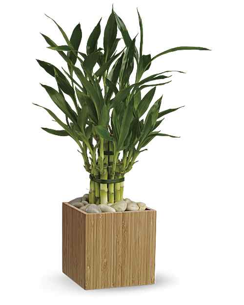Considered lucky because of its peaceful vitality and strong growth, bamboo is an easy-care hydroponic plant that brings peace to any environment. Presented in a Zen natural bamboo cube with white river rocks to keep the canes upright, this lucky bamboo plant is a unique gift for any occasion.
